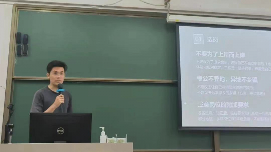随后,4位2019级本科生分别根据自身情况就考公类型、考公资料选择、考公过程规划等主题进行了经验分享,向学弟学妹们讲述经历,传授经验。