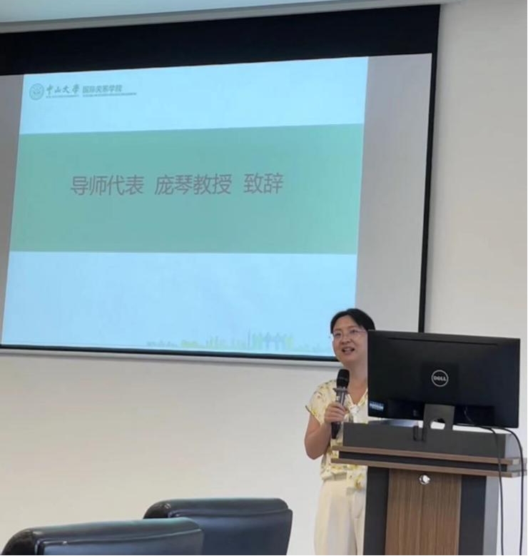 接着,导师代表庞琴教授致辞。她通过华为手机的例子鼓励同学们积极进行学术创新,不仅要学好现有的国际关系理论,更要讲学科内容和其他新兴科技相结合,扩宽专业视野,勇于创新。她指出,经济学及心理学对于国际关系学科的创新具有重要结合意义,并期望同学们可以主动进行跨学科融合,做出有创新性价值的研究。
