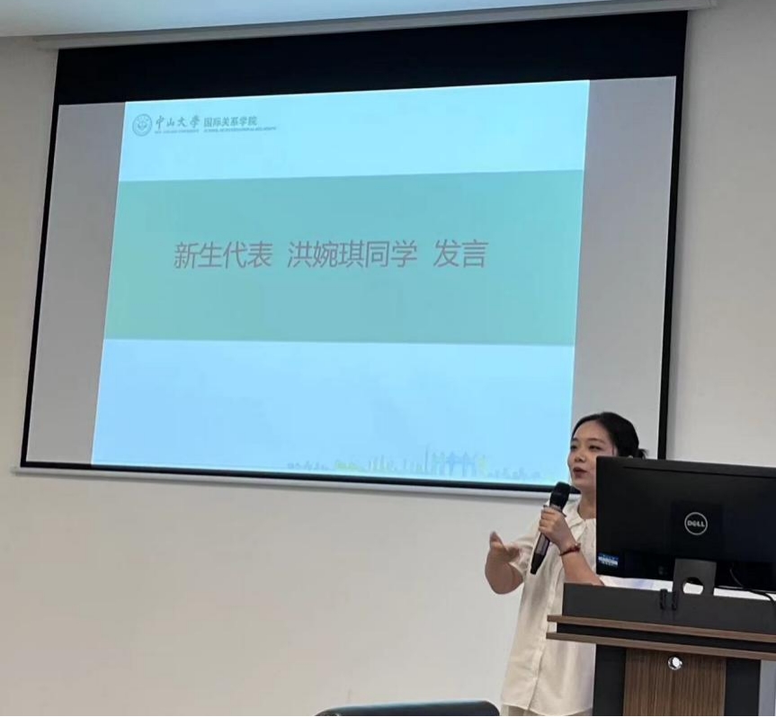 研究生新生代表洪婉琪同学发言。她回忆了四年学习生活中遇到的优秀的老师与同学,并对学院的栽培和老师的指导致以感激。她将在研究生阶段珍惜机会,探索未知以实现梦想,并严格要求自己,争取在时代中谱写新篇章。