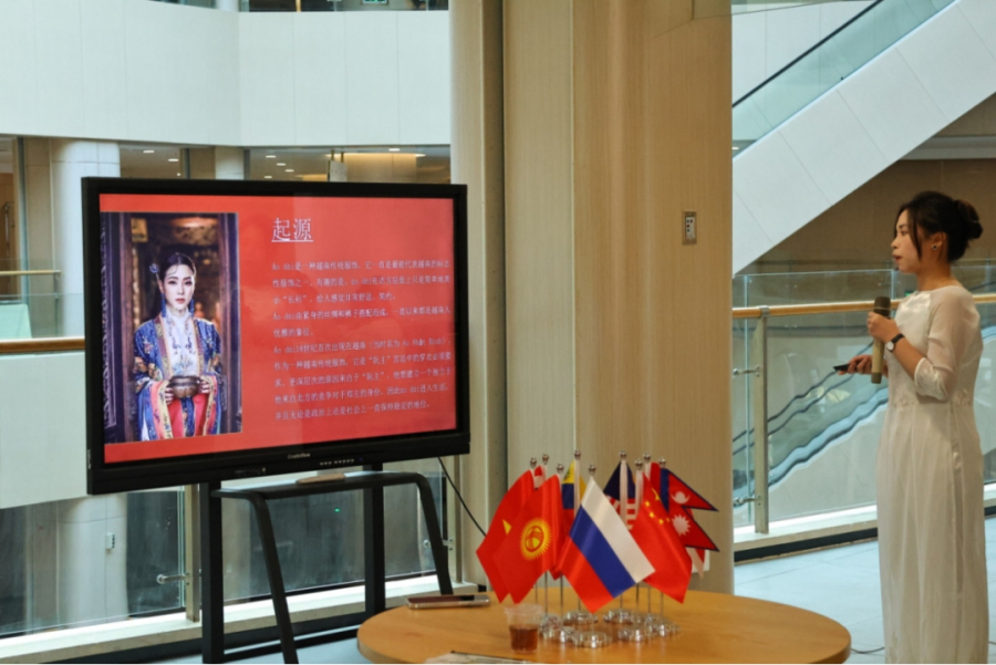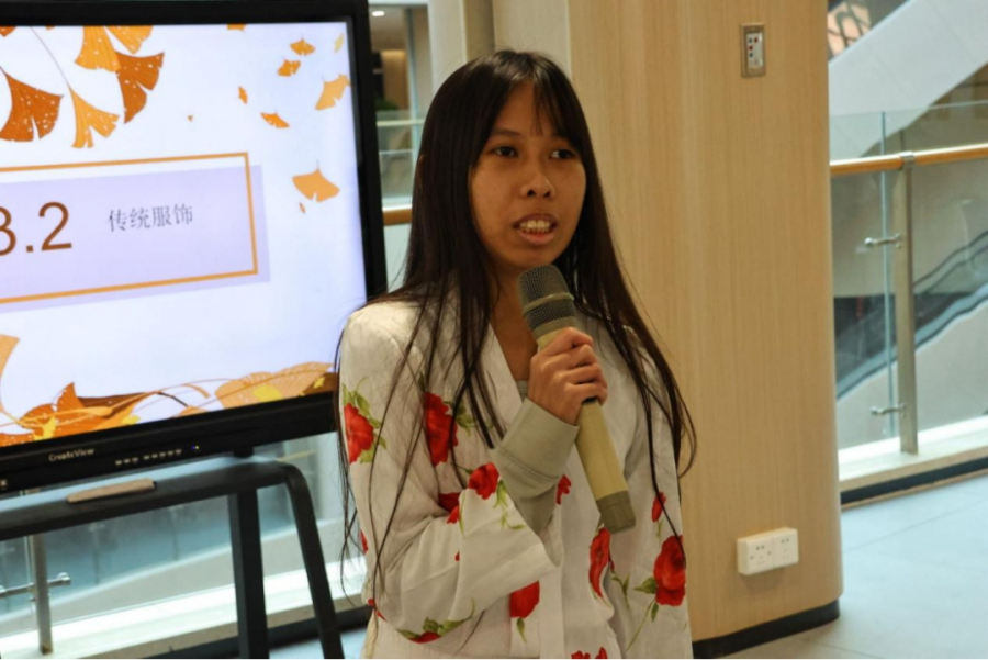 服饰作为承载一方水土文化内涵的媒介,也展现着一个民族生生不息的民族肌理。活动中,来自马来西亚的曾心与来自越南的黄妃燕同学将她们国家的传统服装带到了活动现场,向师生们介绍了其服饰文化的产生背景与文化内涵,并向同学们展示了其服装的特色美感。