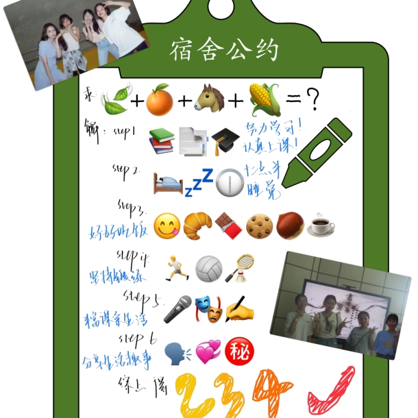宿舍是一个自我与他人持续产生交流碰撞的空间,宿舍生活是私人生活与公共生活的混合体。首先,我们先在硬性的规章制度上凝聚了众人共识,在物理布局上做好了公共区域的规划,在日常事务上制定了以职务内容作为划分标准的轮流制卫生值日安排和明确的夜间熄灯时间红线,齐心协力创造出一个持续稳定、洁净美丽的生活环境,营造一个遵守秩序、相互尊重的和谐氛围。其次,在日常生活实践中我们秉持相互尊重、求同存异的原则,在因个人生活习惯或观点而产生冲突时,我们会积极寻找解决方案。大家也竭力发扬多样性和包容性的精神,在轻松和谐的日常交流中共同学习、增进理解。在学习方面,234宿舍整体学习成绩优异,奖学金获评率达到75%。宿舍四人在学习中互帮互助又彼此尊重,平时学习中有不懂的问题能够随时在宿舍讨论,宿舍学习氛围十分浓厚。