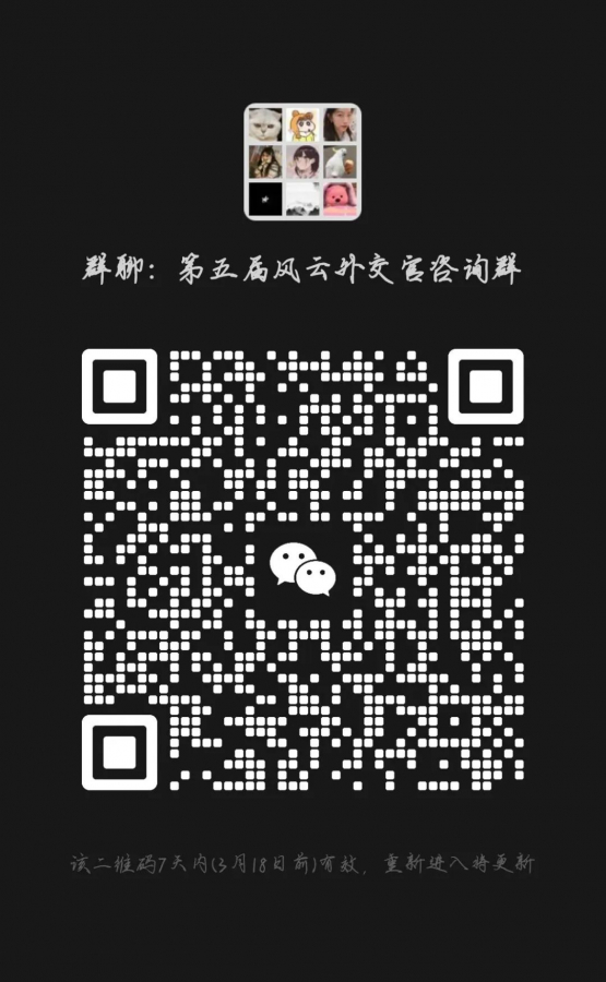 赛前比赛组委会将为各参赛小组提供一份相同的背景文件(见文末附件1)。文件描述了一个架空的,存在主权争端的国际社会。参赛小组须根据题目要求,选择一个议题,撰写一份政策建议书(具体格式见文末附件2),字数在1000字以内。各参赛组需在3月24日20:00前将外交政策建议书提交至邮箱 :875119952@qq.com。组委会将对建议书进行评定并打分,并于3月28日前评选出四组共八人进入复赛。晋级队伍名称将在选手群公布。