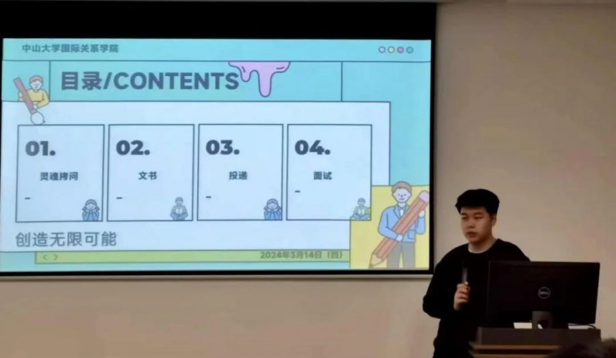 刘天粟同学着重为大家介绍了如何进行文书写作。他从量化原则、相关原则、互补原则与他人原则出发,建议同学们书写时语言客观如实、排版舒适、详略得当,并注意时间的先后排序,突出个人经历的重点部分,给老师营造良好的观感。他还建议同学们可以电子化管理投递资料,不要等到最后时刻再投递。