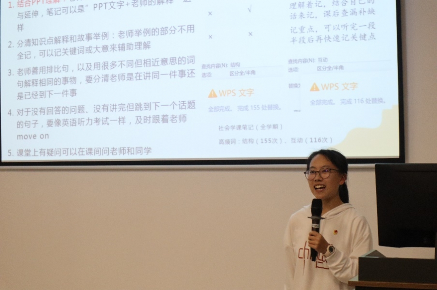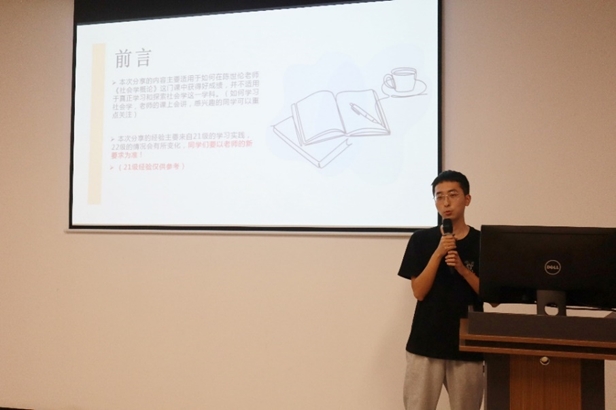 黄正欣同学则从细节上对社会学概论的学习加以说明,提醒同学们遵守学术规范,在备考时要根据期中、期末不同形式的考试调整备考方法,并分享了自己的背书经验以及开卷考试的准备经验。