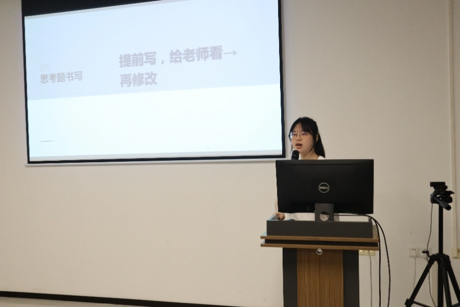 蒋祺钐同学侧重于讲解定量论文的写作。她指出在写作前要关注范文与材料,写作时言有所本,关注文章各个部分的段落架构,保持逻辑的严谨性。此外,她也建议同学们重视小组合作,在力所能及的范围内学习其他统计技能。
