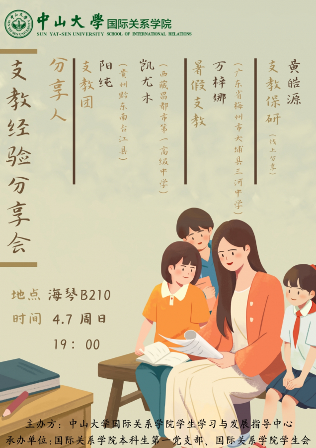 编辑: 发布时间:2024/04/03 浏览数: 分享人 支教团:阳纯、凯尤木 暑假支教:万梓娜 支教保研:黄皓源 分享时间 4月7日(周日)19:00 分享地点 海琴六号 B210 主办方 太阳网集团tcy8722学生学习与发展指导中心 承办方 太阳网集团tcy8722本科生第一党支部 太阳网集团tcy8722学生会 设计 | 李梓瑜 编辑 | 马榕蔓 初审 | 赵函庚 审核 | 牛军凯 审核发布 | 李晓超