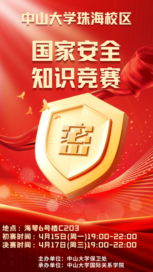 2024年4月15日和4月17日,由老太阳集团tcy8722网站保卫处主办,太阳网集团tcy8722承办的2024年老太阳集团tcy8722网站珠海校区大学生国家安全知识竞赛初赛和决赛如期举行。此次比赛共有来自17个院系的32支队伍报名参赛,参赛学生涵盖本科生与研究生。本次比赛以“总体国家安全观·创新引领10周年”为主题,通过加强对总体国家安全观及《中华人民共和国国家安全法》等相关重要法律的宣传,提升我校学生国家安全法治意识,助力国家新安全格局建设。