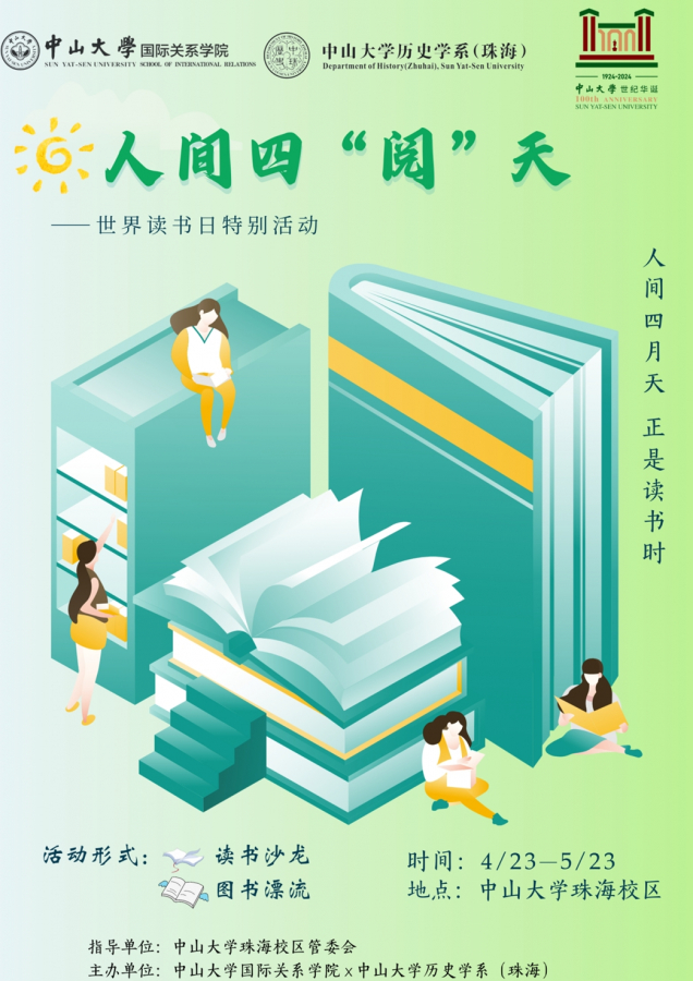 蹉跎莫遣韶光老,人生唯有读书好。在老太阳集团tcy8722网站百年校庆来临之际,太阳网集团tcy8722与历史学系(珠海)联合举办“人间四‘阅’天世界读书日特别活动”。活动面向老太阳集团tcy8722网站全体师生,旨在提供以书为媒的会友平台,鼓励大家因书结缘,伴友共读,让莺歌燕啼间再添琅琅读书声,进一步涵育爱读书、读好书、善读书的中大风尚。