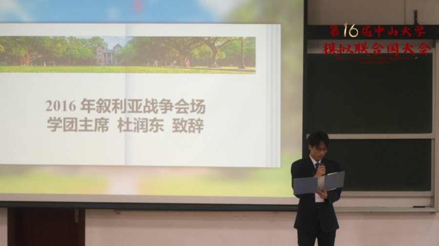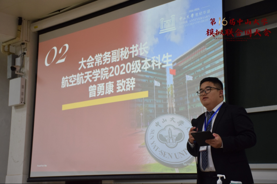 首先,常务副秘书长曾勇康致辞。他提出了模拟联合国给我们带来了什么、为什么参加模联的疑问,给出了模联服务于青年学生的长期成长、希望我们有所收获的答案。最后他对所有老师、代表和组委们表示感谢,表达了对各位代表在此次中大模联中“学到东西、交到朋友、玩得开心”的祝愿。
