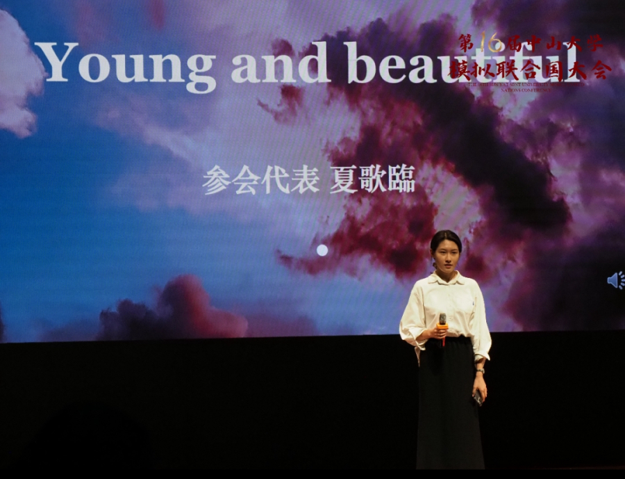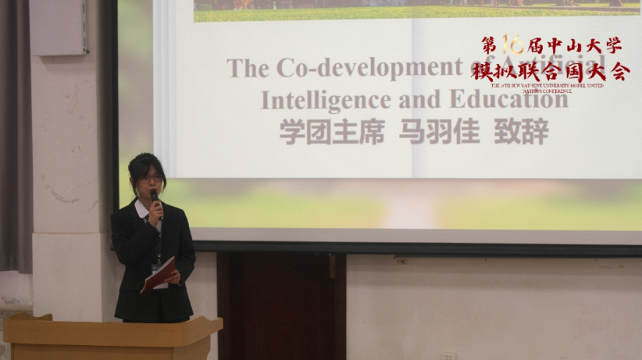 大会秘书长刘婧忻代表大会组委进行致辞,向校内外前来参加中大模联的老师与代表们表示了最热烈的欢迎和由衷的感谢,表达了对代表们享受每一次发言、磋商和辩论,收获知识、收获友谊、收获愉悦的美好期望。