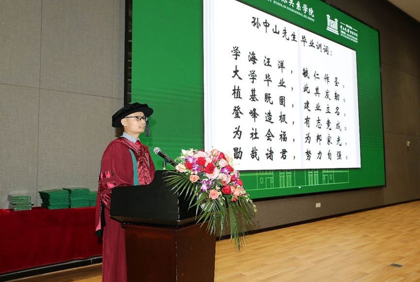 他勉励毕业生在日后的奋斗中首先要铭记中山先生的嘱托,立志做大事。在纷繁众多的事务中,脚踏实地、做好自己的本职工作,便是“做大事”的最好体现。其次,他希望大家能够与身边人一起成长,坚持换位思考、理解他人、与人为善,美美与共。最后,他从“大历史”的角度指出,当今时代相对于混乱的战争和分裂年间,仍然是一个“平静的时代”,大家应在这个相对平静的时代仰望星空、脚踏实地,做好自己的本职工作,奔赴更远大的未来。