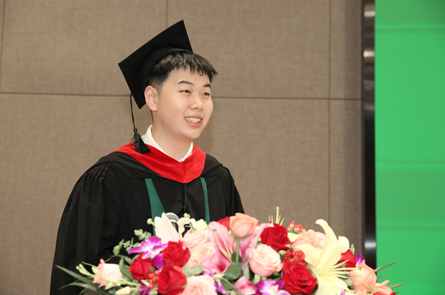毕业生代表刘天粟首先代表全体毕业生向学院全体教师致谢。他提到,学院丰富而扎实的培养体系、对多元文化所秉持的开放与包容培育了独属于国关人的思维和灵魂,使他具备了高度的问题意识与政治敏锐度。毕业不仅是对过去几年辛苦付出的告别,更是向未来出发的信号。他祝愿大家都能拥有锦绣前程,心怀国之大者,同时也兼顾民生小事。最后,他对父母的一路支持陪伴以及坚持不懈的自己表示了感谢。