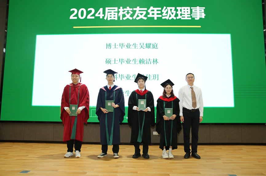 李晓超书记为2024届校友年级理事吴耀庭、赖洁林、吴佳玥、黄氏云颁发纪念品。