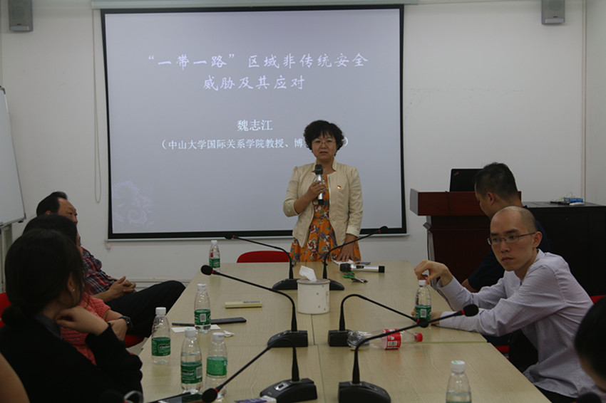魏志江教授在报告中界定了“一带一路”、“安全”、“非传统安全”等基本概念,阐述了“一带一路”区域内存在的恐怖主义、能源安全、跨国境犯罪、海难威胁与救助、环境安全和网络安全六种主要的非传统安全威胁形态,以威胁的突发性、扩散性、转化性、过去发生情况、受关注度、临近程度为指标构建了非传统安全威胁的评估模型,进而,他针对如何应对“一带一路”区域非传统安全威胁提出了相关对策。