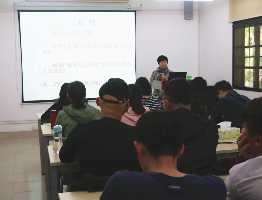 为教育引导学院广大学子坚定理想信念,落实我校“德才兼备、领袖气质、家国情怀”人才培养目标,根据《广东省教育厅关于做好2018年春季学期高校党委书记、校长和院(系)党组织书记、院长(系主任)上第一堂思想政治理论课工作的通知》和学校党委的要求,4月8日下午,我院党总支书记任虹以“深入学习新时代中国特色社会主义思想,在实践中国梦的奋斗中实现自身价值”为主题,给2017级本科生上了一堂别开生面的思政课。