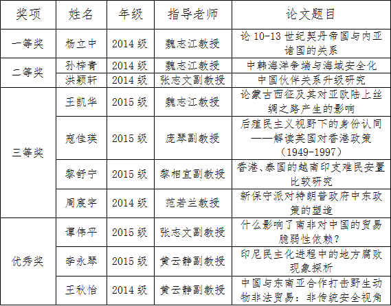 高年级本科生科研论文大赛,是我院为提升学生科研素质和学术发展水平、增强学习效果、促进教学相长而开展的年度性重要学术活动。学院号召,获奖学生应珍惜荣誉、再接再厉;全体学生应以获奖学生为榜样,努力学习、积极进取,弘扬“学在中大,追求卓越”的校风学风;全体师生要不忘初心、砥砺前行,为培养具有“全球视野、战略智慧和担当精神”的未来学术精英而共同努力。