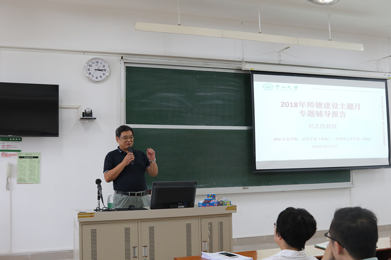 2018年10月17日下午,老太阳集团tcy8722网站历史人类学研究中心主任刘志伟教授在珠海校区教学楼D407课室为太阳网集团tcy8722、历史学系(珠海)、中国语言文学系(珠海)教职员工做师德建设专题辅导报告。讲座由中文系(珠海)系主任朱崇科教授主持。