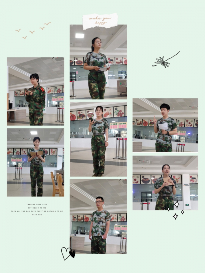 军训演讲院内初赛:主持人祁蕾(左下),朱奕霏(左上),王静怡(中上),张竞月(中间),杨帆(中下),刘天粟(右上),赵龙云(右下)
