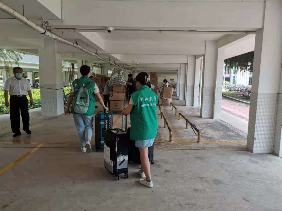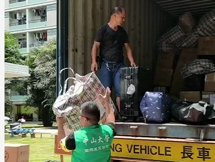 在广州校区南校园有序组织行李搬运和人员上车时,周昀老师带着珠海校区的学生志愿者们也开始展开工作,协助搬运行李、对到达的行李进行分类分房号进行摆放,指引协助搬家师傅按宿舍将行李搬至对应宿舍。2020级的不少同学们到达珠海校区后主动到行李寄存点一起参与行李整理,配合搬家公司,让行李上楼速度提高了不少。当天下午4点前就完成行李搬运上楼和所有行李清点,没有任何行李缺漏遗失。