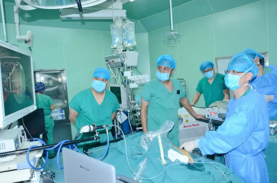 ▲许可慰(右前)在喀地一院为结石宝宝进行公益手术