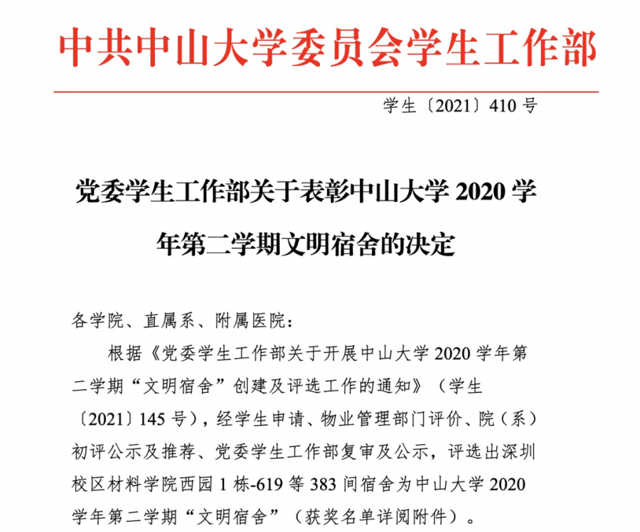 学生宿舍是促进学生身心健康和全面发展的重要场所。通过建设“文明宿舍”,更好地服务学生培养。学院官微将在近期推出以上获奖宿舍的相关事迹,希望全院同学向先进集体学习,积极创建文明宿舍,着力营造“学在中大,追求卓越”的优良校风学风,促进自身德智体美劳全面发展。