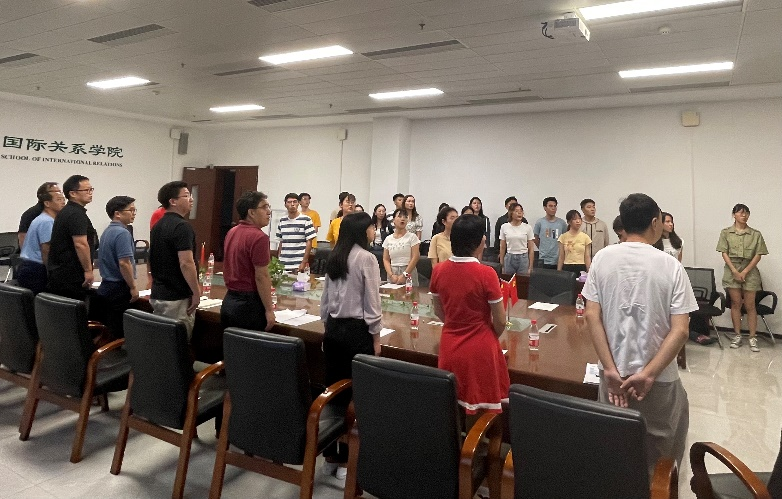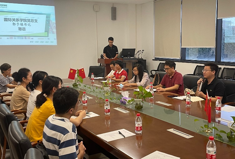 奏唱国歌后,郭书记为新生寄语。他首先代表学院对全体2021级研究生新生的到来表示衷心祝贺和热烈欢迎,希望他们成为具备“德才兼备、领袖气质、家国情怀”的优秀人才。之后,他对新生提出三点要求:一是树立政治自觉,胸怀中华民族伟大复兴战略全局和世界百年未有之大变局,深入学习习近平外交思想;二是树立学术自觉,找到自己的学术方向和志趣,找准学术接口,持之以恒努力;三是树立文化自觉,文化自信是更基本、更深沉、更持久的力量,要以中国立场看世界。
