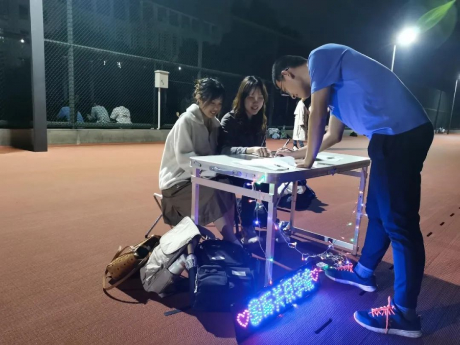 工作人员鼓励同学们积极参加夜跑
