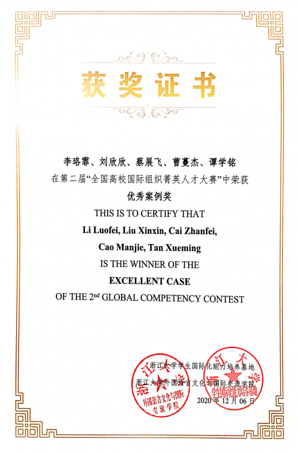 全国高校国际组织菁英人才大赛获奖证书