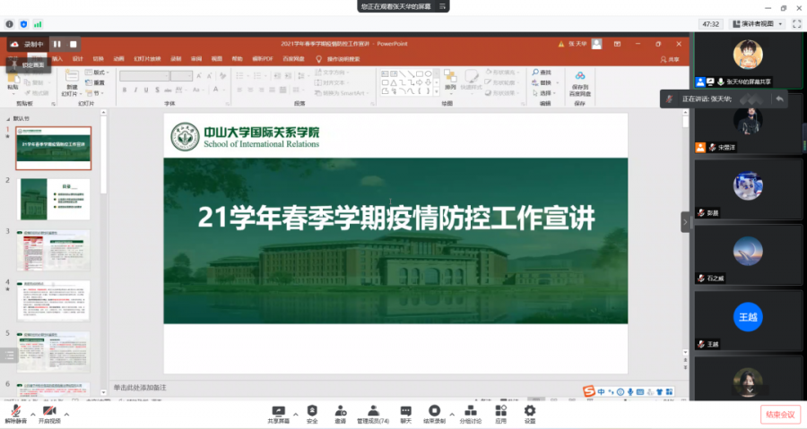 周昀副书记、张天华老师对疫情防控政策进行宣讲,介绍了现阶段疫情传播的特点,再次强调了疫情防控各项措施的必要性与重要性,讲解了公民遵守并配合落实防疫措施的相关法律规定,重点讲解了近期疫情防控措施,要求同学们牢固树立疫情防控主体责任意识,不打折扣地严格执行疫情防控各项要求,为疫情防控贡献力量。
