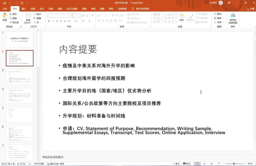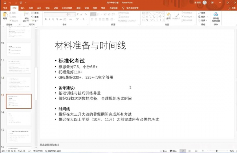 接下来,王俊民校友详细说明了海外升学相关材料的准备流程。对于雅思、托福、GRE等标准化考试,要做到基础训练与技巧训练并重,注重平时练习积累,合理规划考试时间;在制作简历方面,可以从教育背景、学术科研经历、实习经历、领导力展示等多个方面入手,有效提高自身综合竞争力。王俊民校友讲解了主文书撰写、网上申请等多项流程的操作方法,分享了成功申请境外高校的学生案例,为学弟学妹们送上真诚的祝福与期待。