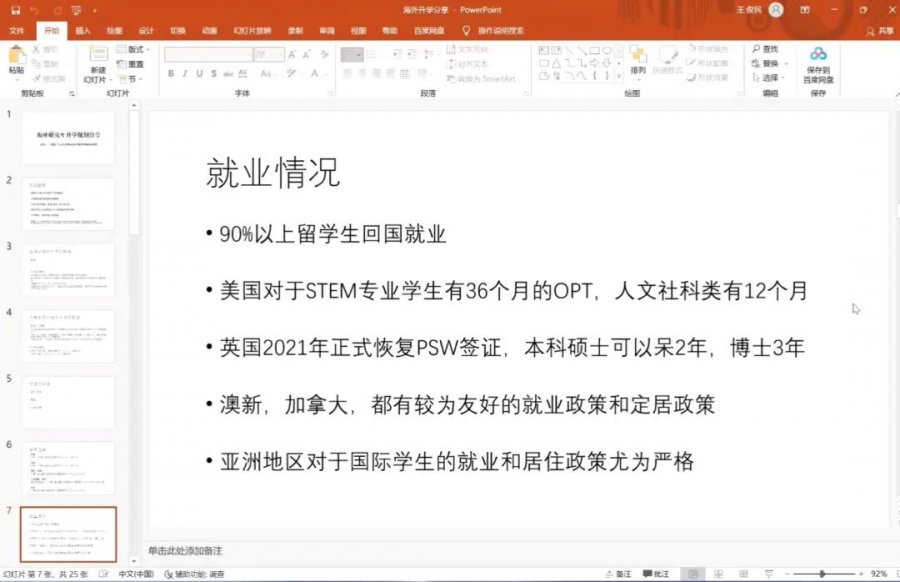 王俊民校友谈到近年来申请境外高校博士学位的人数在增长,举例展示了国关学科博士的境外院校选择与毕业去向,鼓励有志于学术科研道路的同学就读博士。