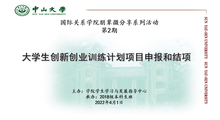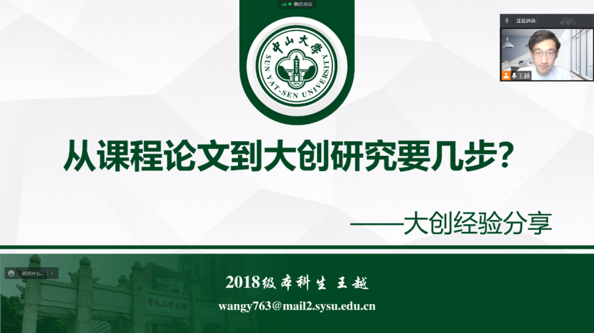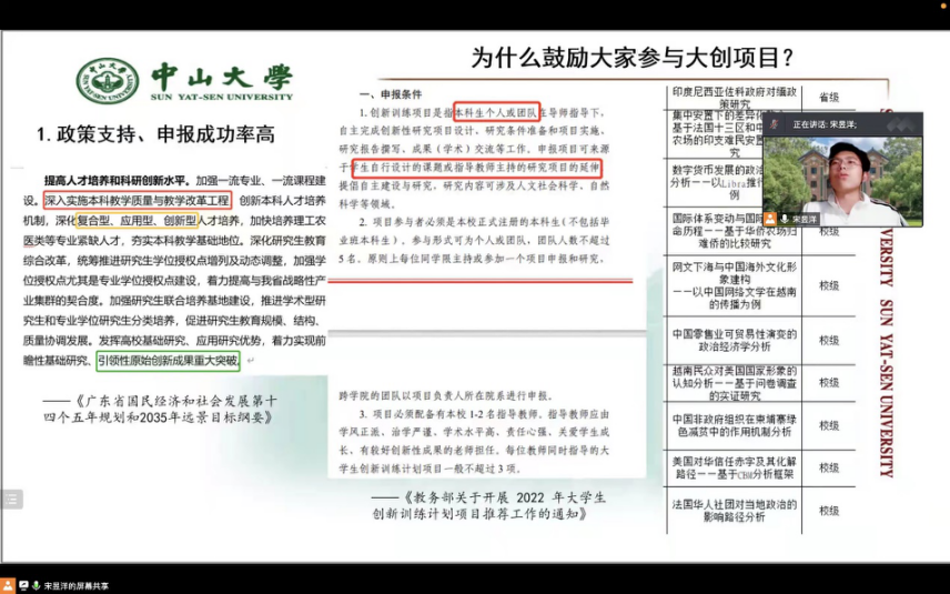 2022年4月1日晚7点30分至9点,太阳网集团tcy87222018级本科生宋昱洋、史沛婕、朱荟岚、王越线上作“大学生创新创业训练计划项目申报和结项”的专题分享。本次活动由学院学生学习与发展指导中心主办、2018级本科生班级承办,由宋昱洋主持。