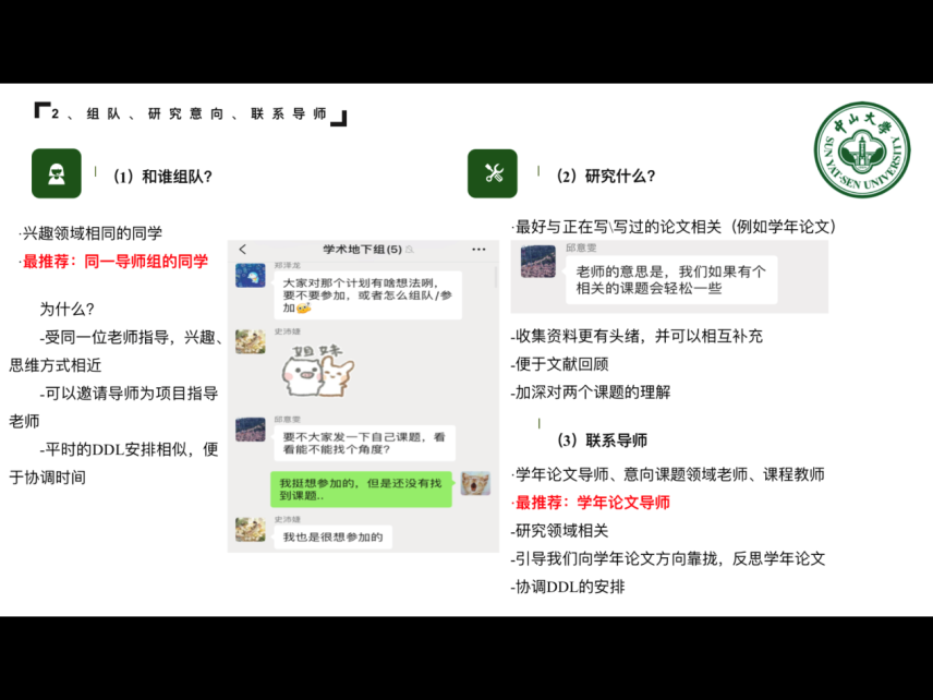 朱荟岚介绍了所在队伍申报前的准备和实施项目的经验教训。针对申报准备,她建议在申报前关注教务老师的通知,以及和兴趣领域相同的同学组队,譬如同一导师组的同学可以组队。她还建议同学们研究的问题可以是写过的或正在写的论文相关的问题。关于选导师,她建议可以邀请学年论文导师、意向课题领域老师或课程教师等。在实施项目方面,朱荟岚建议同学们关注课程老师以往对论文写作的基本要求,例如资料新颖、充足,论证清晰、准确,语言流畅等。针对临时组队的同学如何在多人合作中确保论文风格的统一这一问题,朱荟岚提议大家一是确保组员目标一致,及时沟通,交换想法;二是需要互相批注与修改。