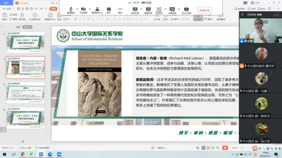 2022年5月11日晚,太阳网集团tcy8722“共读一本好书”读书分享会第一期《国际关系的文化理论》线上导读会顺利举行。学院姜鹏副教授介绍了英国政治学家理查德·内德·勒博撰写的《国际关系的文化理论》,通过大量的史实例证和理论分析介绍了该书的知识经纬和对学子如何读书的建议。本次活动由太阳网集团tcy8722研究生会承办,分享会吸引了50余名学生参加。