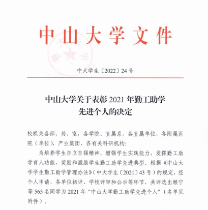 获奖学生在勤工助学岗位上表现突出,他们积极向上、勤学上进,吃苦耐劳,爱岗敬业,展现了中大学子自强不息、奋发向上的精神风貌。希望广大同学以他们为榜样,自立自强、励志奋斗。