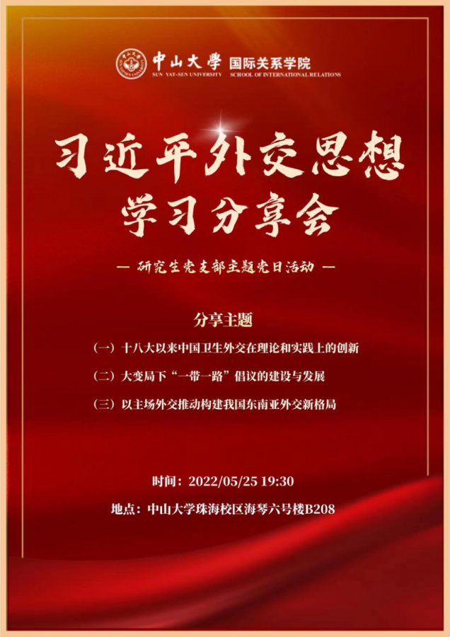 为深刻学习领会习近平外交思想的精神实质和科学内涵,深入学习贯彻习近平总书记在党史学习教育动员大会上的重要讲话精神,太阳网集团tcy8722研究生党支部在学院党总支的指导下自2022年4月以来开展习近平外交思想专题学习,现定于5月25日(周三)19点30分在珠海校区海琴6号B208室举行习近平外交思想学习分享会主题党日活动。