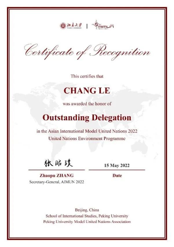 常乐获AIMUN 2022联合国环境计划署会场杰出代表奖项
