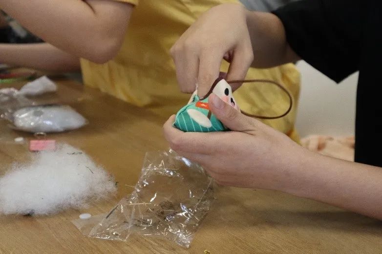 穿针、缝边、填充干艾叶和海绵、再到封口、串珠、挂绳、最后系上流苏,一系列流程后,一个可爱的端午香囊就完成了。