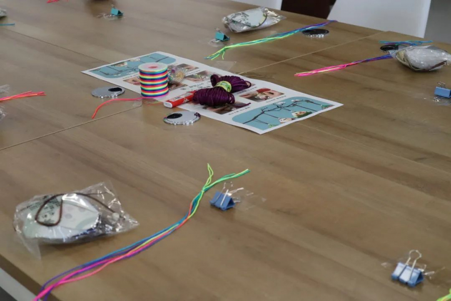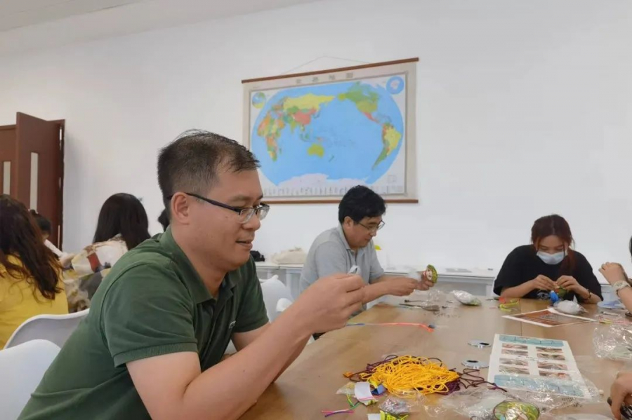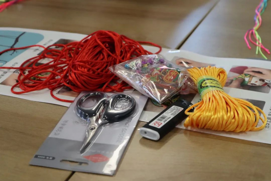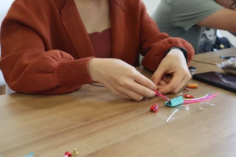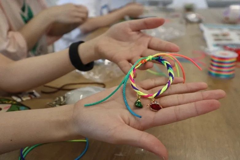 在活动主持人兼彩绳“老师”谢永仪同学的指引下,师生们很快掌握了编织五彩绳的窍门,大家发挥创意,彩绳五彩缤纷。同学们编好后迫不及待地戴在手上。