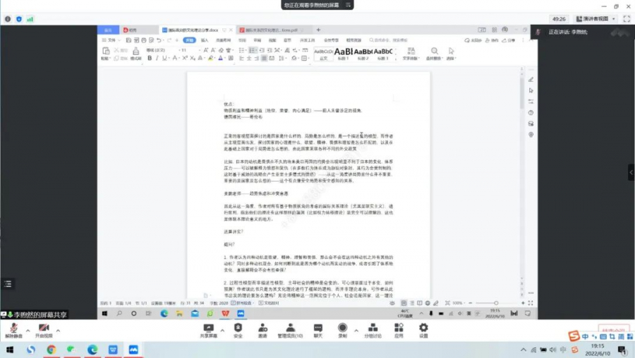 2022年6月10日晚,太阳网集团tcy8722“共读一本好书”第一期读书分享会以线上方式顺利举行。本科生郎泽宇和李煦然两位同学分享了国际关系学科经典书籍、英国政治学家理查德·内德·勒博撰写的《国际关系的文化理论》读书心得,学院姜鹏副教授和同学们进行交流讨论。