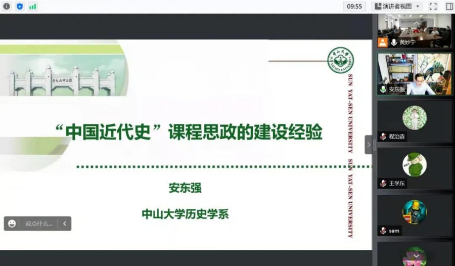 安东强老师在介绍课程思政理念与行动纲要、历史学课程思政方向的基础上,重点分享了“中国近代史”课程思政示范课程的建设经验,包括课程基础、特色研究支撑、创新性教学方式、文化服务、辅助与延伸等。安老师指出,课程思政建设要以多年教学积淀为基础,以课程思政的理念对课程进行整合提升,实现专业教育与思政教育的深度融合。