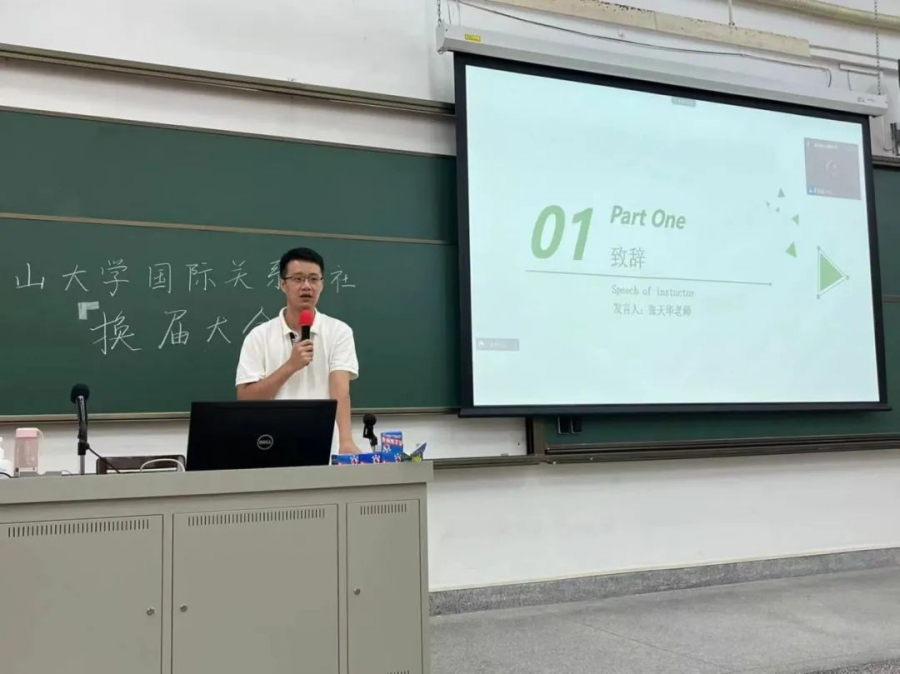 行政指导老师张天华老师作开场致辞,他首先肯定了国际关系学社在过去一年所做出的成绩,通过克服现实困难,较好地完成学社的年度工作计划,学社成员和参与社团活动的学生收获良多,成绩斐然。随后张老师对往年学社工作做了简单回顾、也对新一届学社成员提出要求和期望。