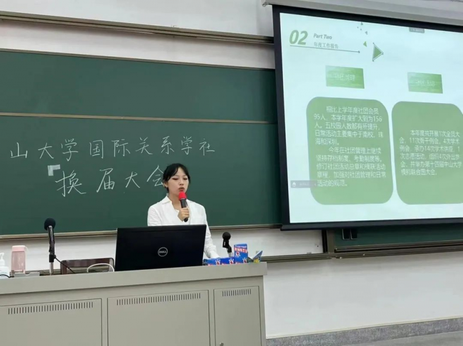 社长姚懿真向与会师生做了国关学社2021-2022学年度工作报告。她从社团管理、社团活动和社团成就三个方面简要回顾了过去一年开展的各项工作,着重回顾了由学社主办的第十四届老太阳集团tcy8722网站模拟联合国大会的盛况以及初次举办线上模联大会的成功与挑战,总结了社团该年度取得的成绩。