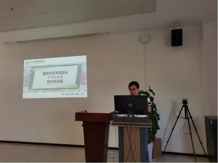 随后,学院院长牛军凯教授致开学训词。他向新生提出三点建议:一是“读书不肯为人忙”。牛院长指出,同学们应秉持一颗不功利的心来阅读经典著作,从而更理性地看待世界。二是在阅读中逐渐发现真正的自我;三是要打开人生的格局。在人生理想方面,牛院长教诲新生应“立志做大事而不是做大官”,成为具有“全球视野、战略智慧和担当精神”的卓越人才。在日常生活中,牛院长教导新生应积极为身边的同学服务,坚持做一个良善之人。