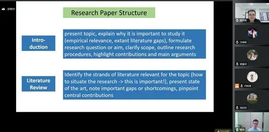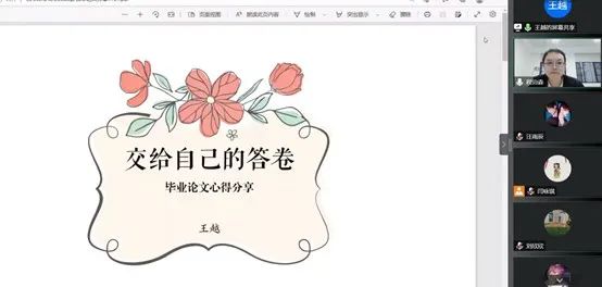 我院2022届校级优秀本科毕业论文获得者王越和史沛婕同学进行了论文写作经验的分享。王越同学着重说明了论文写作中态度的重要性,并就论文写作中的论文性质、对完美主义的追求以及字数问题交流了自己的理解。史沛婕同学结合文献查找的经历提供了搜集文献资料方法的建议,并分享了论文修改过程中每个版本单独保存等实用技巧。