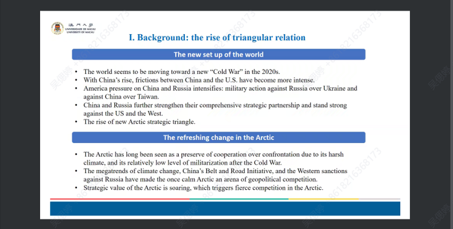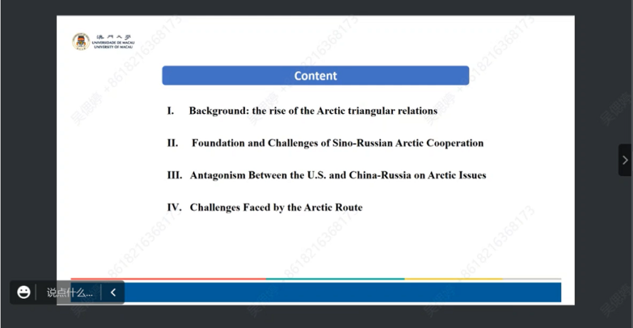讲座分四个部分探讨了中美俄三方在北极航线的合作与竞争。首先是北极三角关系的兴起,其次是中俄北极合作的基础和挑战,第三是中美俄在北极问题上的对立,第四是北极航线面临的挑战。