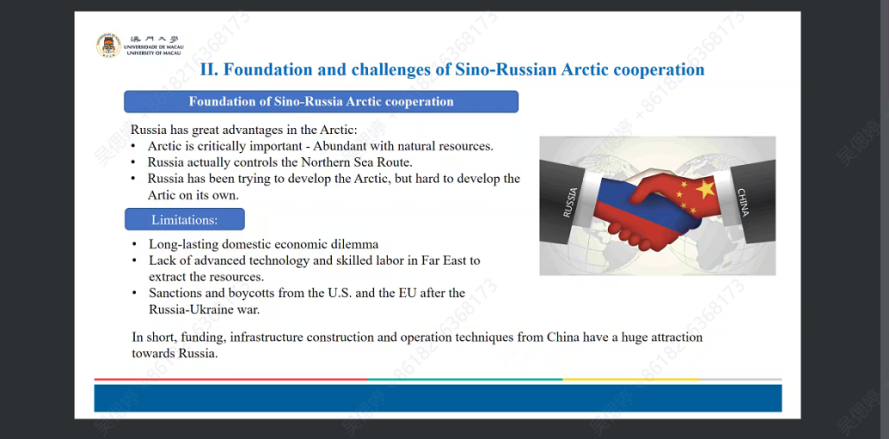 其次,盛教授探讨了中俄北极合作的基础和挑战。指出中俄北极合作虽然以互利共赢为目的,但仍是应对西方压力的权宜之计。俄方对北极地区的控制心态与中方对北极事务的参与意图之间的矛盾,将持续影响两国后续合作。