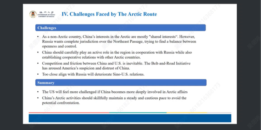 第四,盛老师提出了中国在北极航线面临的四个挑战,即:如何从现实出发声索北极权力;如何协调与俄罗斯及其他北极国家间的关系;中国在北极事务中过于进取可能导致中美冲突;中俄的过度接近将影响中美关系。
