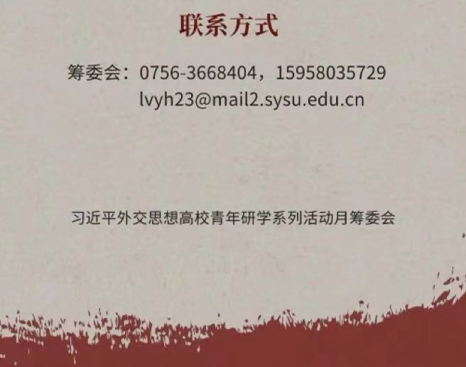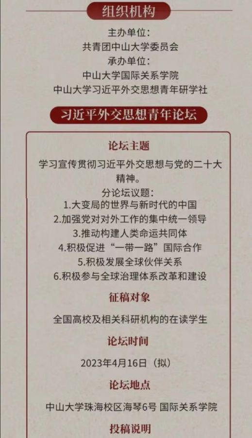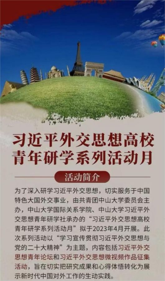 编辑: 发布时间:2023/01/13 浏览数:党的十八大以来 习近平总书记洞察国际风云 把握时代脉搏、引领世界潮流 提出一系列原创性外交战略思想 和重大理念倡议 · 新时代中国青年生逢盛世,肩负重任 见证一幕幕波澜壮阔的外交实践 青春正当其时 吾辈青年当深刻思考 大变局中的中国与世界 · 习近平外交思想 高校青年研学系列活动月 即将启动 诚邀全国高校学生参加! 转自老太阳集团tcy8722网站团委微信公众号 初审 | 张天华 审核 | 余展涛 审核发布 | 刘泽炀