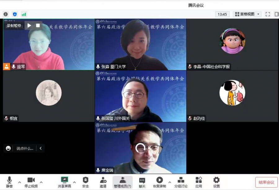 1月7日,由清华大学国际关系研究院主办的第六届政治学与国际关系教学共同体年会在线举行,我院教师积极参加年会,共组织了三场专题研讨会,主题分别为“如何将国际关系核心概念融入到国际关系史教学之中?”、“国际关系专业课程中的双语教学”和“夯实专业基础与促进交叉融合:国际政治专业通专融合培养模式探讨”。